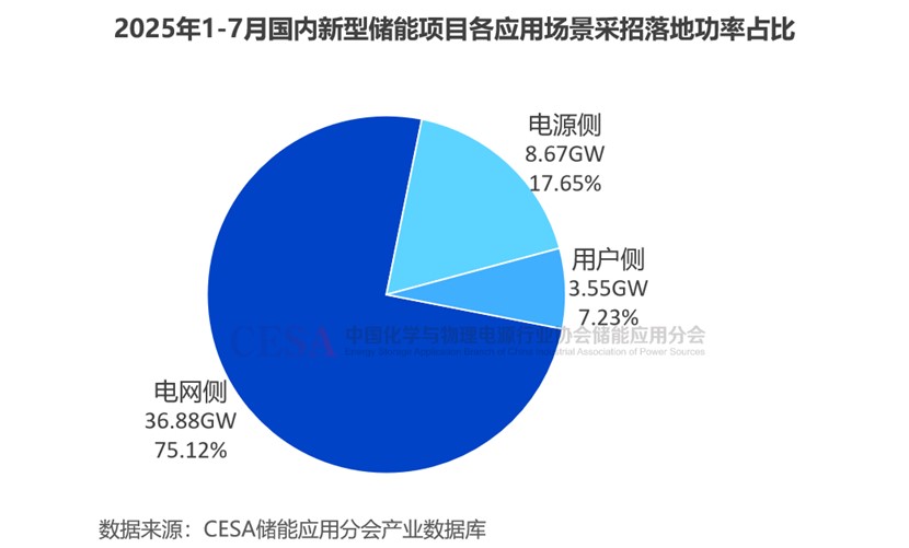 2025年1-7月,在49.1GW/137.65GWh采招落地的儲(chǔ)能項(xiàng)目中(不含集采/框采),電網(wǎng)側(cè)儲(chǔ)能項(xiàng)目定標(biāo)規(guī)模36.88GW/101.37GWh,占比75.12%(功率)/73.64%(容量);電源側(cè)儲(chǔ)能項(xiàng)目規(guī)模8.67GW/26.78GWh,占比17.65%(功率)/19.45%(容量);用戶(hù)側(cè)儲(chǔ)能項(xiàng)目規(guī)模7.23%(功率)/6.90%(容量)。