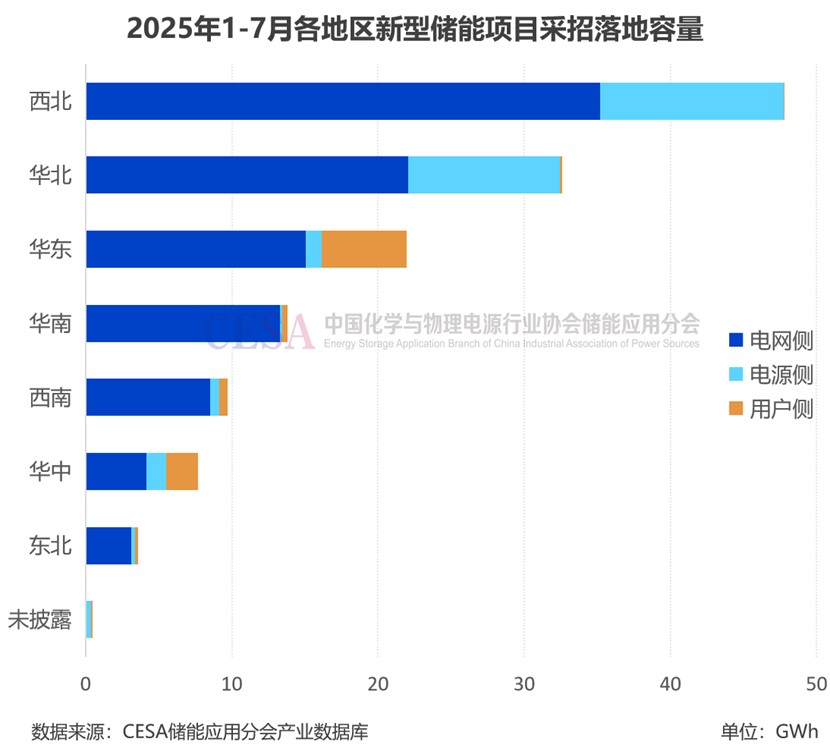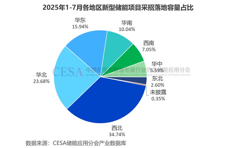 據(jù)CESA儲(chǔ)能應(yīng)用分會(huì)產(chǎn)業(yè)數(shù)據(jù)庫(kù)不完全統(tǒng)計(jì),2025年1-7月在49.1GW/137.65GWh采招落地的儲(chǔ)能項(xiàng)目中(不含集采/框采),西北地區(qū)采招落地規(guī)模最大,達(dá)14.27GW/47.82GWh,占比29.07%(功率)/34.74%(容量),主要為源網(wǎng)側(cè)項(xiàng)目。