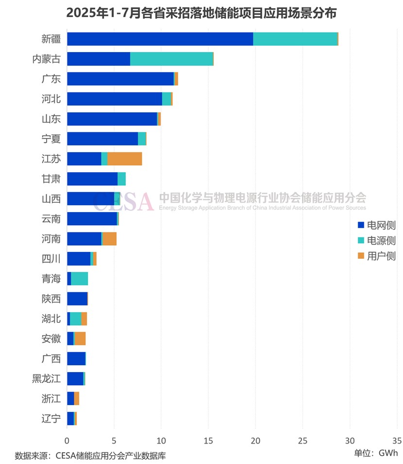 據(jù)CESA儲(chǔ)能應(yīng)用分會(huì)產(chǎn)業(yè)數(shù)據(jù)庫(kù)不完全統(tǒng)計(jì),2025年1-7月在49.1GW/137.65GWh采招落地的儲(chǔ)能項(xiàng)目中(不含集采/框采),新疆采招落地7.32GW/28.73GWh,位居全國(guó)首位,占比14.90%(功率)/20.87%(容量),主要為源網(wǎng)側(cè)項(xiàng)目,電網(wǎng)側(cè)采招落地19.74GWh,電源側(cè)采招落地8.95GWh,源側(cè)和網(wǎng)側(cè)規(guī)模均居全國(guó)之首。
