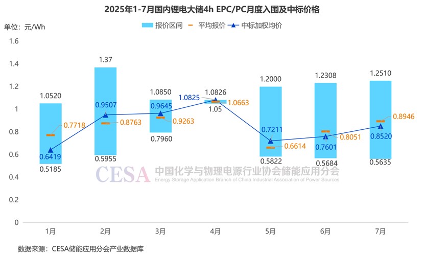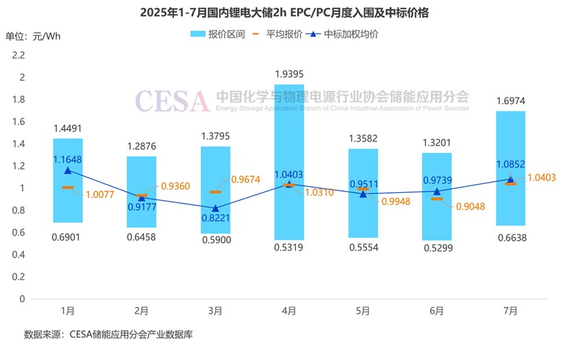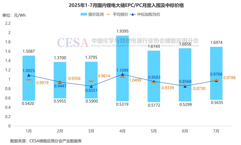 據(jù)CESA儲(chǔ)能應(yīng)用分會(huì)產(chǎn)業(yè)數(shù)據(jù)庫(kù)不完全統(tǒng)計(jì),2025年1-7月,鋰電儲(chǔ)能EPC/PC采招落地項(xiàng)目入圍報(bào)價(jià)主要集中在0.5172-1.9395元/Wh區(qū)間內(nèi),平均報(bào)價(jià)1.006元/Wh,中標(biāo)加權(quán)均價(jià)0.9753元/Wh。