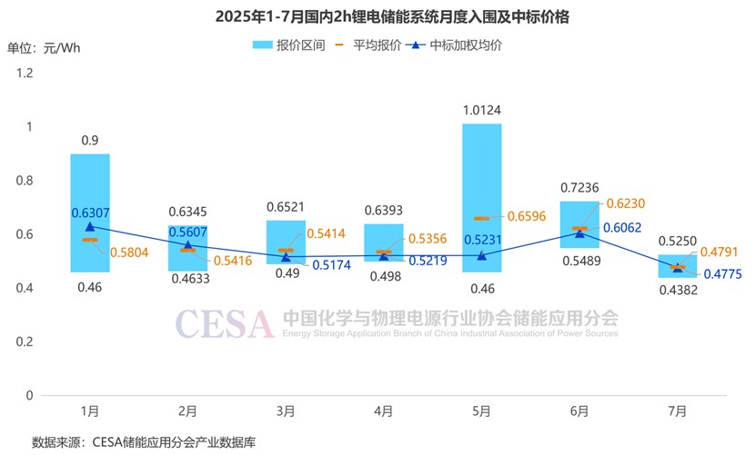 據(jù)CESA儲(chǔ)能應(yīng)用分會(huì)產(chǎn)業(yè)數(shù)據(jù)庫(kù)不完全統(tǒng)計(jì),2025年1-7月,鋰電儲(chǔ)能系統(tǒng)(不含工商業(yè)儲(chǔ)能柜)采招落地項(xiàng)目入圍報(bào)價(jià)主要集中在0.404-1.0124元/Wh區(qū)間內(nèi),平均報(bào)價(jià)0.5327元/Wh,中標(biāo)加權(quán)均價(jià)0.4849元/Wh。