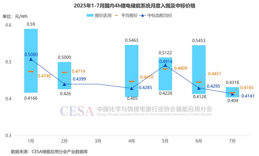 2025年1-7月,4h鋰電儲(chǔ)能系統(tǒng)(不含工商業(yè)儲(chǔ)能柜)采招落地項(xiàng)目入圍報(bào)價(jià)主要集中在0.404-0.59元/Wh范圍內(nèi),平均報(bào)價(jià)0.4577元/Wh,中標(biāo)加權(quán)均價(jià)0.4414元/Wh。最低入圍報(bào)價(jià)來(lái)自于國(guó)華投資國(guó)能蒙東莫旗風(fēng)電基地項(xiàng)目?jī)?chǔ)能設(shè)備采購(gòu),7月中車(chē)株洲所以14544萬(wàn)元的投標(biāo)報(bào)價(jià)入圍成為第二中標(biāo)候選人,折合單價(jià)0.404元/Wh。