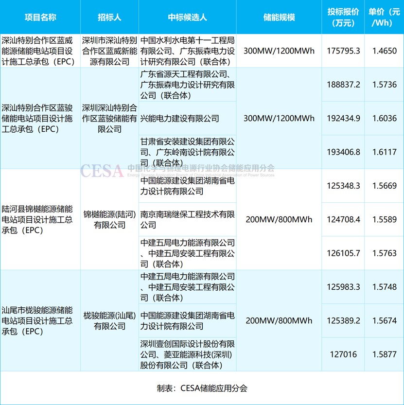 最低報(bào)價(jià)來(lái)自于深汕特別合作區(qū)藍(lán)威能源儲(chǔ)能電站項(xiàng)目設(shè)計(jì)施工總承包(EPC),2025年5月,中國(guó)水利水電第十一工程局有限公司、廣東振森電力設(shè)計(jì)研究有限公司以175795.3412萬(wàn)元的報(bào)價(jià)中標(biāo),折合單價(jià)1.465元/Wh。