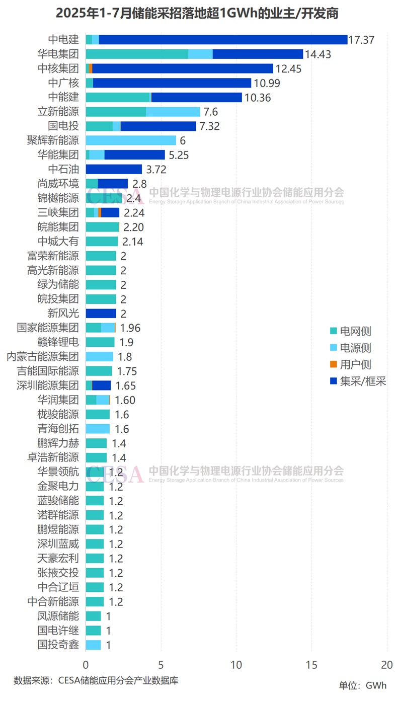 2025年1-7月,中電建、華電集團(tuán)、中核集團(tuán)、中廣核、中能建5大集團(tuán)采招落地均超過(guò)10GWh,這5家集采/框采總規(guī)模超過(guò)50GWh。