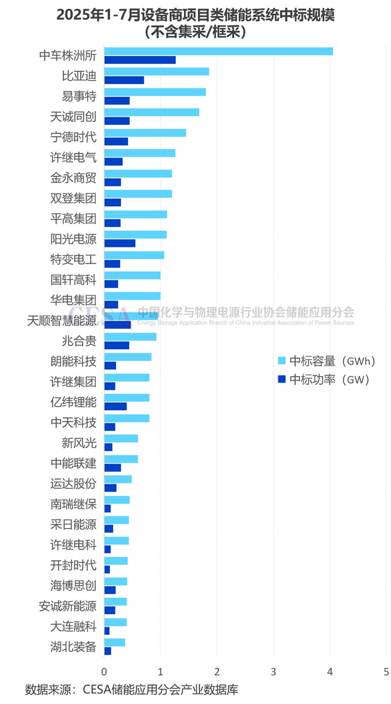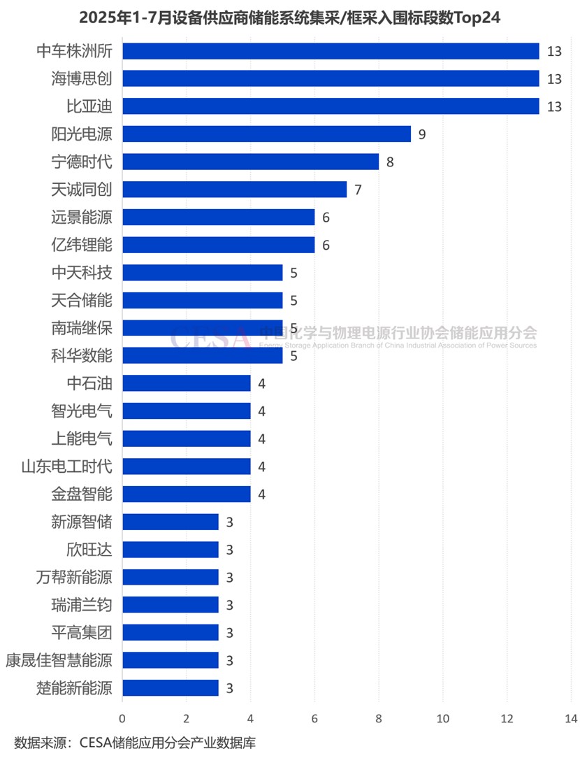 2025年1-7月儲(chǔ)能系統(tǒng)(含直流側(cè))集采/框采入圍標(biāo)段數(shù)量最多的是比亞迪、海博思創(chuàng)、中車(chē)株洲所,均達(dá)到13個(gè)。