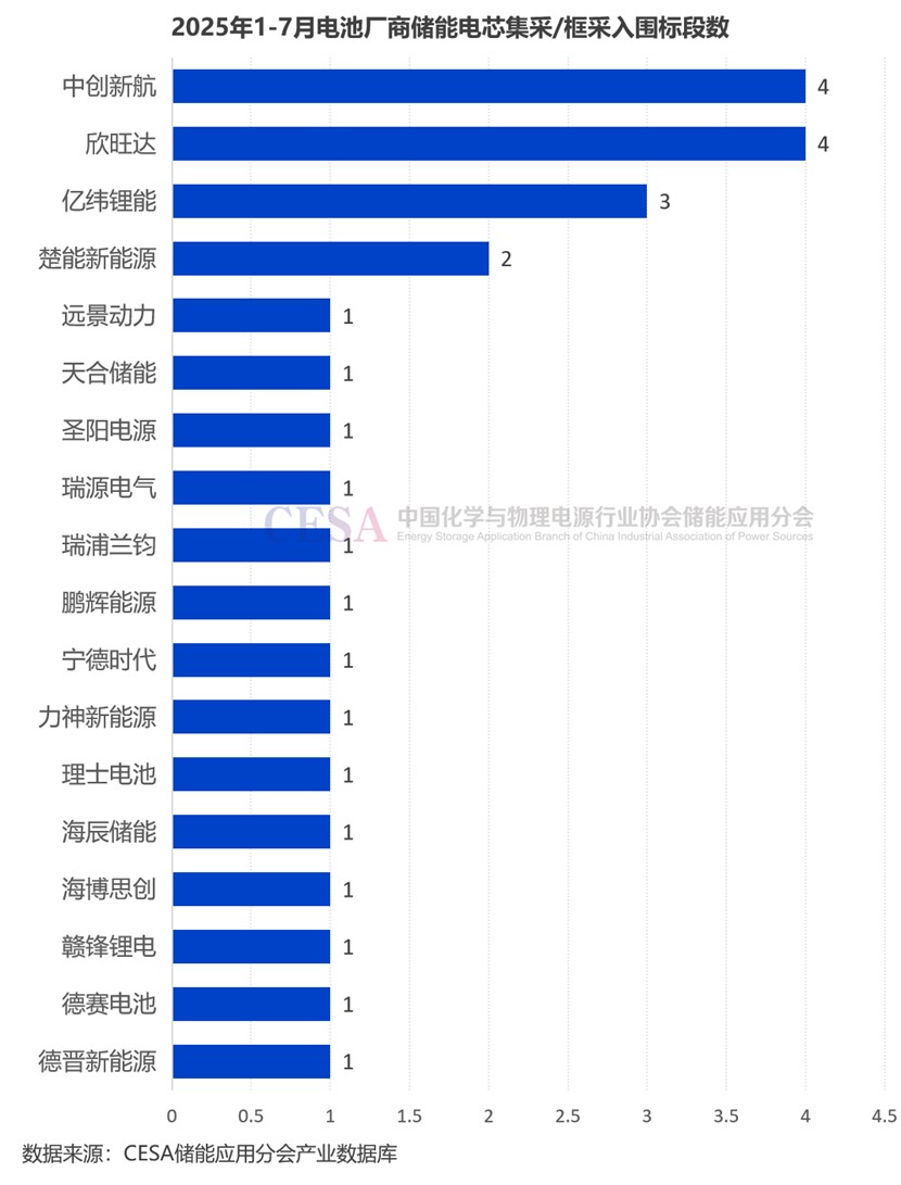 2025年1-7月儲(chǔ)能電芯集采/框采落地總規(guī)模達(dá)7.8GWh,入圍標(biāo)段數(shù)量最多的是中創(chuàng)新航和欣旺達(dá),均達(dá)到4個(gè)。億緯鋰能3個(gè),楚能新能源2個(gè)。