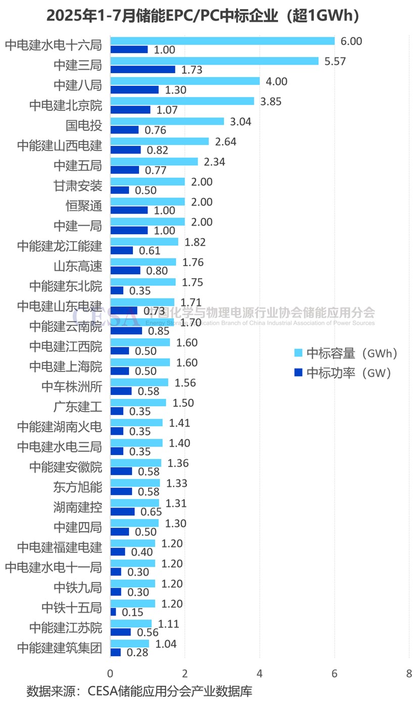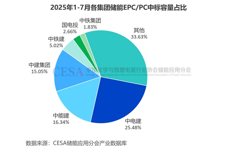 從集團(tuán)層面分析,2025年1-7月,中電建儲(chǔ)能EPC/PC中標(biāo)規(guī)模最大,達(dá)8.84GW/29.13GWh,容量占比25.48%。