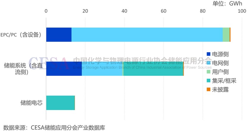2024年,EPC/PC(含設備)定標規(guī)模為38.05GW/94.14GWh,容量占比52.54%,中標金額超1230億元;儲能系統(tǒng)中標/中標候選人公示規(guī)模為22.85GW/70.26GWh,容量占比39.21%,中標金額超340億元;電芯采招落地為14.78GWh,容量占比8.25%,中標金額超10億元。