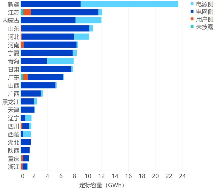 2024年,10個省市自治區(qū)定標規(guī)模超過6GWh,新疆、江蘇、內(nèi)蒙古、山東、河北位居前五,中標(候選人)公示規(guī)模均超10GWh,前五總落地規(guī)模約占全國的一半。