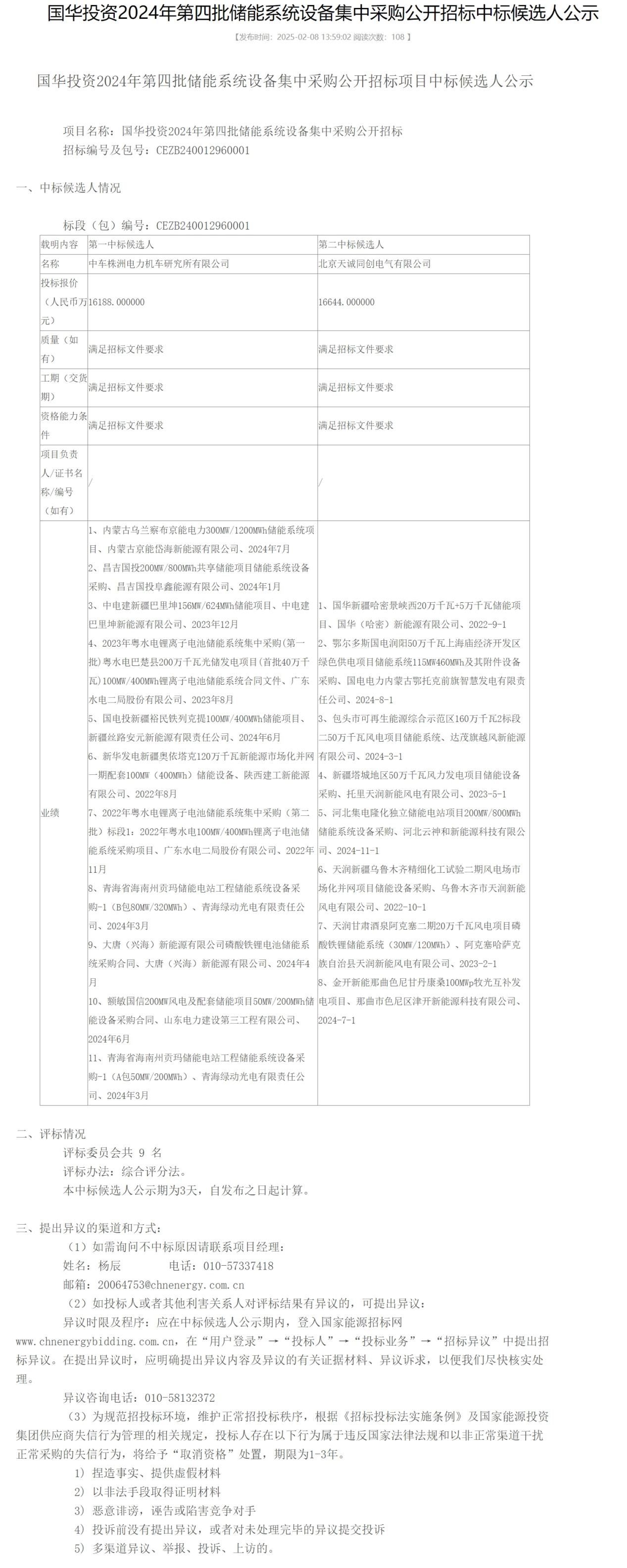 第二中標(biāo)候選人:北京天誠同創(chuàng)電氣有限公司,投標(biāo)報價16644萬元,折合單價0.438元/Wh。