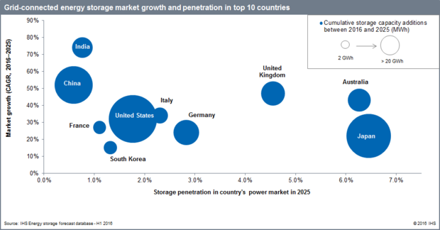 IHS預(yù)測,未來10年,鋰離子電池將成為主流儲能技術(shù),到2025年將占到全球儲能市場的逾80%。僅今年,全球儲能市場將翻番,容量將由2015年的140萬千瓦時增長至290萬千瓦時。據(jù)IHS預(yù)測,到2025年,全球并網(wǎng)儲能系統(tǒng)容量將激增至2100萬千瓦。