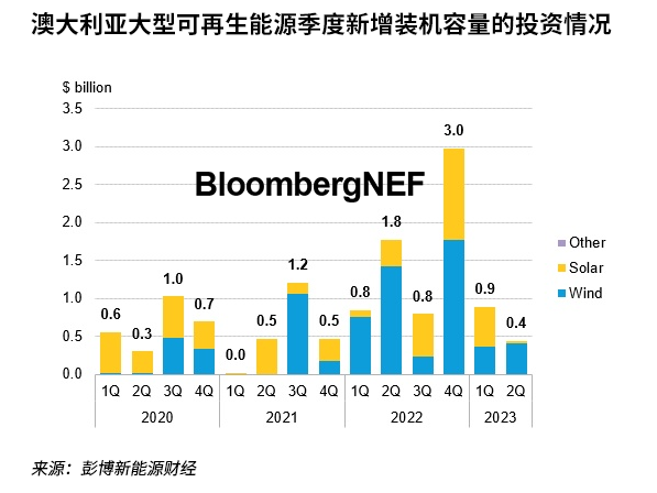 彭博新能源財經(jīng)估計,2023年第二季度對大型可再生能源新增裝機容量的投資額為4.39億美元(合6.64億澳元)——在第一季度表現(xiàn)強勁后環(huán)比下降50.7%,同比降75.3%。