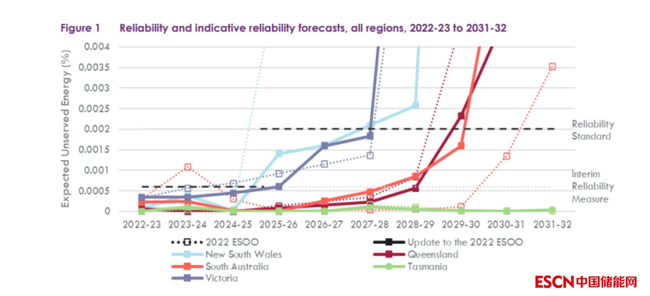 他提到,自發(fā)布2022年ESOO以來,南澳大利亞州(2023-24年)和維多利亞州(2024-25年)的短期預(yù)測可靠性差距已經(jīng)被新的天然氣發(fā)電、風(fēng)電和電池儲能的發(fā)展所填補,同時現(xiàn)有燃?xì)獍l(fā)電機的退役也被推遲。因此,在此次更新的可靠性預(yù)測中不需要新的零售商可靠性義務(wù)(RRO)可靠性工具。從2025年起,與臨時可靠性措施相比,可靠性差距開始出現(xiàn)。預(yù)計從2027年起,各大陸地區(qū)的預(yù)期使用率將超過可靠性標(biāo)準(zhǔn),到2031-2032年時,的所有大陸地區(qū)都將違反可靠性標(biāo)準(zhǔn),至少有5座燃煤電廠預(yù)計將退役,占NEM總?cè)萘康募s13%。因此,迫切需要對可再生能源、長時儲能和傳輸進行緊急和持續(xù)的投資,以可靠地滿足澳大利亞家庭和企業(yè)的需求。具體如下圖所示: