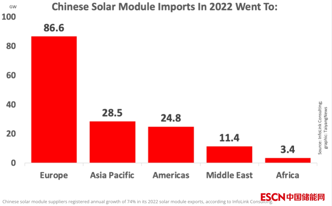 中國儲能網(wǎng)訊:據(jù)市場信息公司InfoLink Consulting的數(shù)據(jù),2022年中國向世界各國出口了154.8 吉瓦的太陽能光伏組件,比2021年(88.8 吉瓦)增長了74%;其中歐洲是最大的出口目的地,達(dá)到86.6吉瓦。