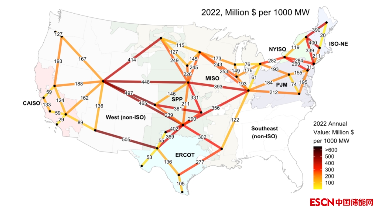 圖 1. 2022 年在許多地區(qū)觀察到高輸電價值。 顯示了假設(shè)的 1000 MW 傳輸線路的年度累計值。這些值均為邊際值(適用下一組傳輸線路容量)并且僅基于每小時的能源價格套利。請注意,我們無法分析定價數(shù)據(jù)有限或不可用的輸電價值,例如在非ISO東南地區(qū)。