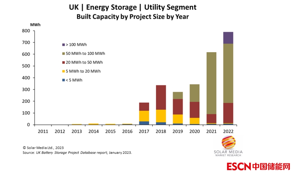 上圖顯示了英國按儲(chǔ)能項(xiàng)目規(guī)模和年份劃分的儲(chǔ)能容量,其中2022年部的署儲(chǔ)能系統(tǒng)大幅超過了2021年的617MWh。