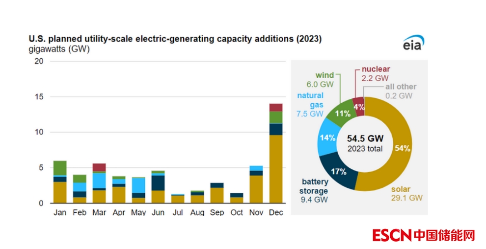 在2023年美國計(jì)劃新增的發(fā)電資產(chǎn)中,電池儲(chǔ)能系統(tǒng)占17%,太陽能發(fā)電設(shè)施占54%。