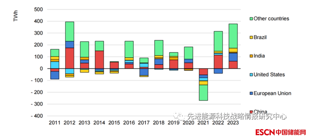 圖4 2011-2023年全球主要國(guó)家水力發(fā)電量同比變化趨勢(shì)(單位:太瓦時(shí))