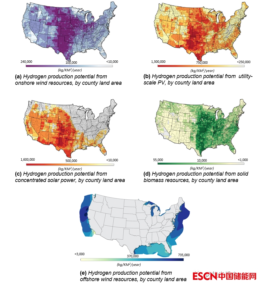 陸上風(fēng)電、太陽能光伏、海上風(fēng)電、聚光太陽能以及生物質(zhì)能制造清潔氫能的生產(chǎn)潛力。來源:NREL