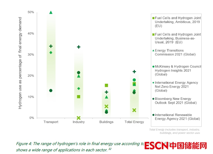 假設(shè)氫氣以相應(yīng)的閾值成本提供,上面幾種情景顯示了運(yùn)輸、工業(yè)和電網(wǎng)等關(guān)鍵部門潛在清潔氫需求的估計(jì)值。