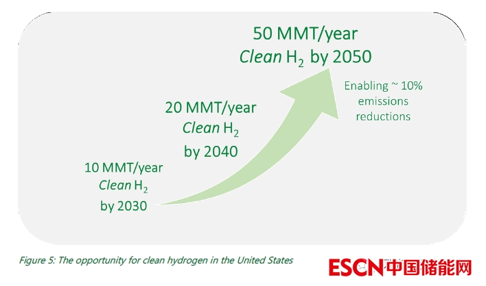 報(bào)告提供了當(dāng)今美國氫能生產(chǎn)、運(yùn)輸、儲(chǔ)存和使用的情況,以及清潔氫在促進(jìn)不同部門國家目標(biāo)方面所能提供的機(jī)會(huì)。清潔氫能脫碳應(yīng)用的路徑取決于 2030 年、2040 年和 2050 年的需求情景——到 2030 年每年生產(chǎn) 1000 萬噸 (10 MMT)、到 2040 年每年 2000萬噸以及到 2050 年每年 5000萬噸的戰(zhàn)略機(jī)遇。