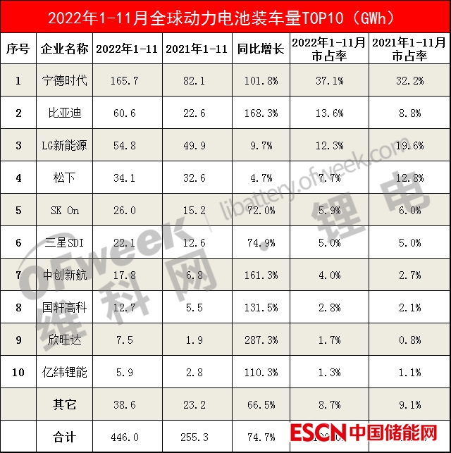 2022年1-11月全球動(dòng)力電池裝車量TOP10的企業(yè)分別是:寧德時(shí)代、比亞迪、LG新能源、松下、SK On、三星SDI、中創(chuàng)新航、國(guó)軒高科、欣旺達(dá)、億緯鋰能。