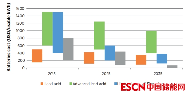 圖S2:到2015年、2025年和2035年,鉛酸、先進(jìn)鉛酸、鋰離子和流式蓄電池的預(yù)期成本下降