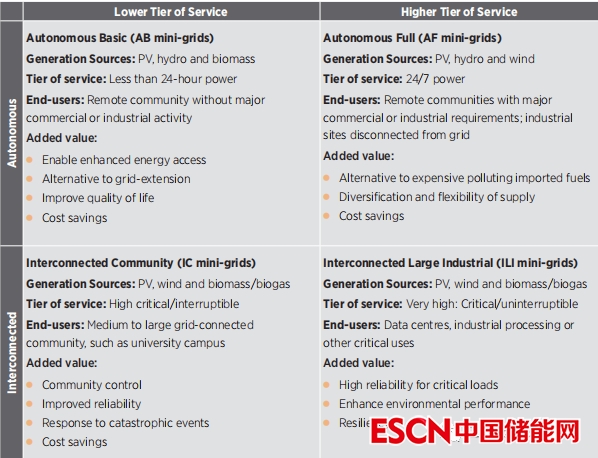 迷你網(wǎng)格可以根據(jù)其與網(wǎng)格的連接和所提供的服務(wù)水平進(jìn)行分類。一個(gè)可再生的微型電網(wǎng)可以相互連接到主電網(wǎng),或者獨(dú)立于鄰近的電網(wǎng),在這種情況下,它被認(rèn)為是自主的。可再生的微型電網(wǎng)可以提供不同水平的服務(wù),從僅提供照明等基本服務(wù)到更高水平的服務(wù),如滿足商業(yè)能源需求。表S1提供了這些類別的概述。