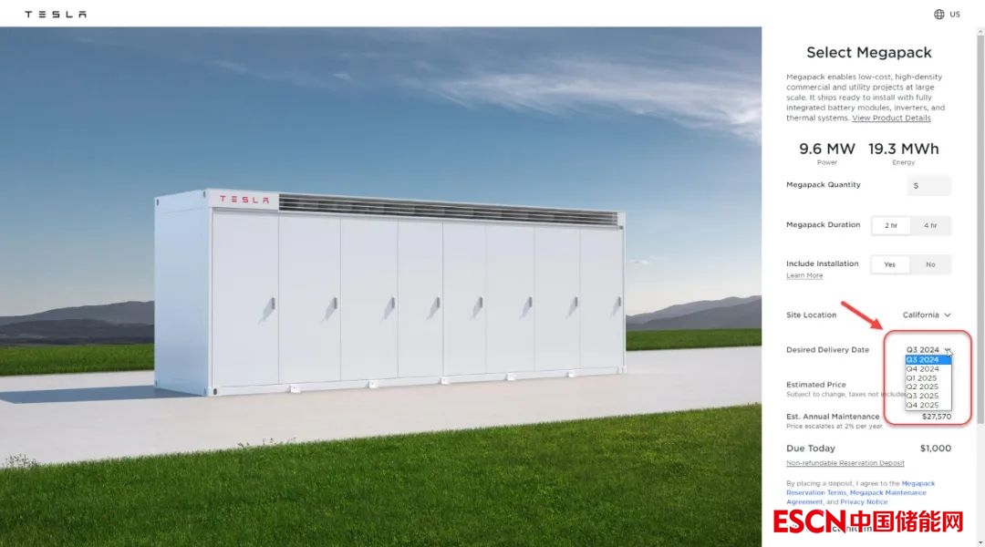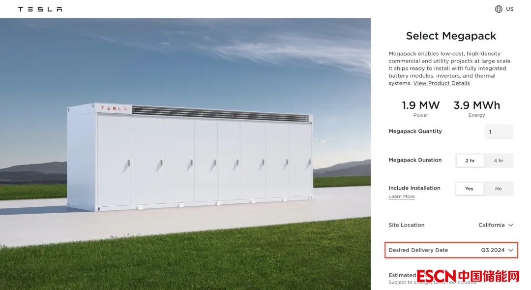 中國儲能網(wǎng)訊:近日,特斯拉官方網(wǎng)站顯示,其電池儲能系統(tǒng)Megapack訂單的最早預計交付日期將在2024年第三季度。