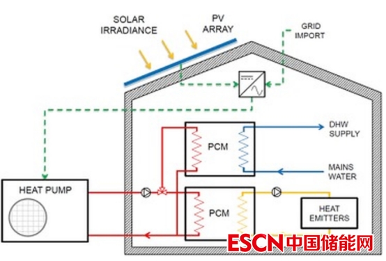 設(shè)計(jì)該系統(tǒng)的科學(xué)家表示,這項(xiàng)工作的創(chuàng)新之處在于為典型房屋開發(fā)了兩種不同系統(tǒng)配置的綜合熱網(wǎng)絡(luò)模型。這兩種配置包括標(biāo)準(zhǔn)配置:熱泵系統(tǒng)+熱水缸以及高級配置:熱泵系統(tǒng)+兩個(gè)相變材料(PCM)儲熱系統(tǒng)。其中,PCM可以在規(guī)定的溫度范圍內(nèi)吸收、儲存和釋放大量潛熱。