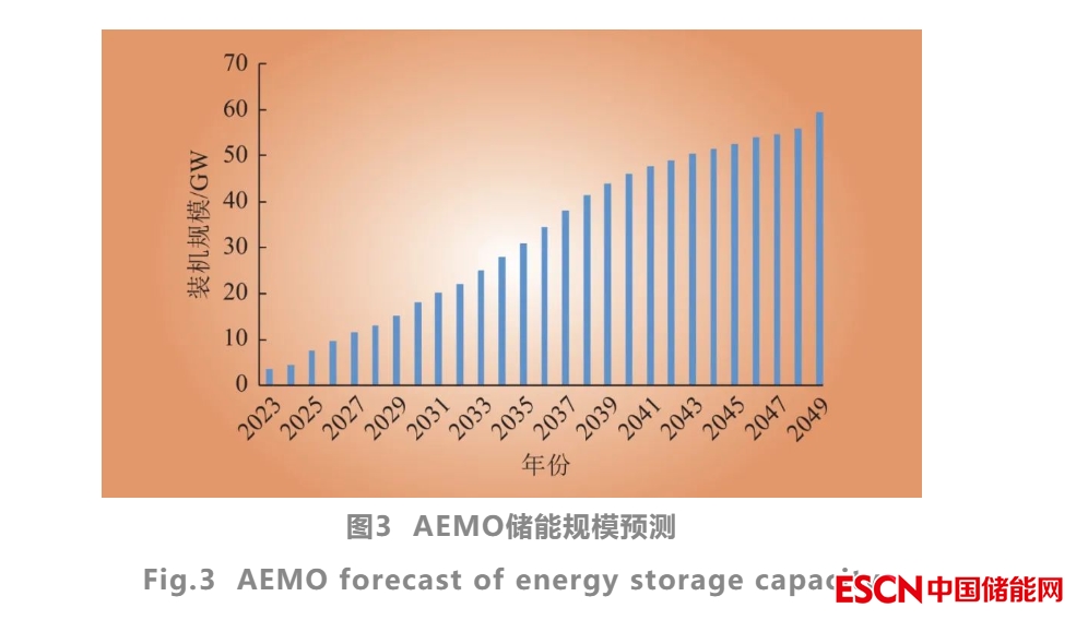 2021年12月,澳大利亞能源市場(chǎng)運(yùn)營機(jī)構(gòu)(AEMO)發(fā)布2022年綜合能源計(jì)劃(ISP2022),計(jì)劃到2049年儲(chǔ)能規(guī)模接近60 GW,預(yù)測(cè)規(guī)模如圖3所示[24]。其中,戶用型儲(chǔ)能(含光儲(chǔ))占比70%,大型電池儲(chǔ)能占比20%,抽蓄等其他儲(chǔ)能占比10%。