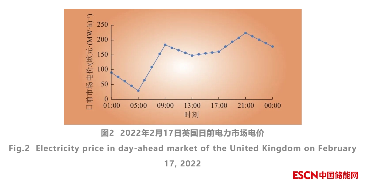 在峰谷套利方面,目前,英國日前市場(chǎng)的平均價(jià)差顯著提高,儲(chǔ)能價(jià)格不斷下降,獨(dú)立儲(chǔ)能或新能源配套儲(chǔ)能通過平衡單元等負(fù)荷聚合商參與日前市場(chǎng)和平衡市場(chǎng),已基本具備盈利能力。2022年2月17日的英國日前市場(chǎng)電價(jià)如圖2所示,峰谷電價(jià)差達(dá)到200歐元/(MW·h),2 h和4 h儲(chǔ)能的平均峰谷套利價(jià)差為192歐元/(MW·h)、160歐元/(MW·h)左右。據(jù)測(cè)算分析,2、4 h儲(chǔ)能日均套利價(jià)差達(dá)到149歐元/(MW·h)(約合人民幣1.02元/(kW·h))、111歐元/(MW·h)(約合人民幣0.76元/(kW·h)),即可實(shí)現(xiàn)盈利(目標(biāo)杠桿回報(bào)率為10%)。