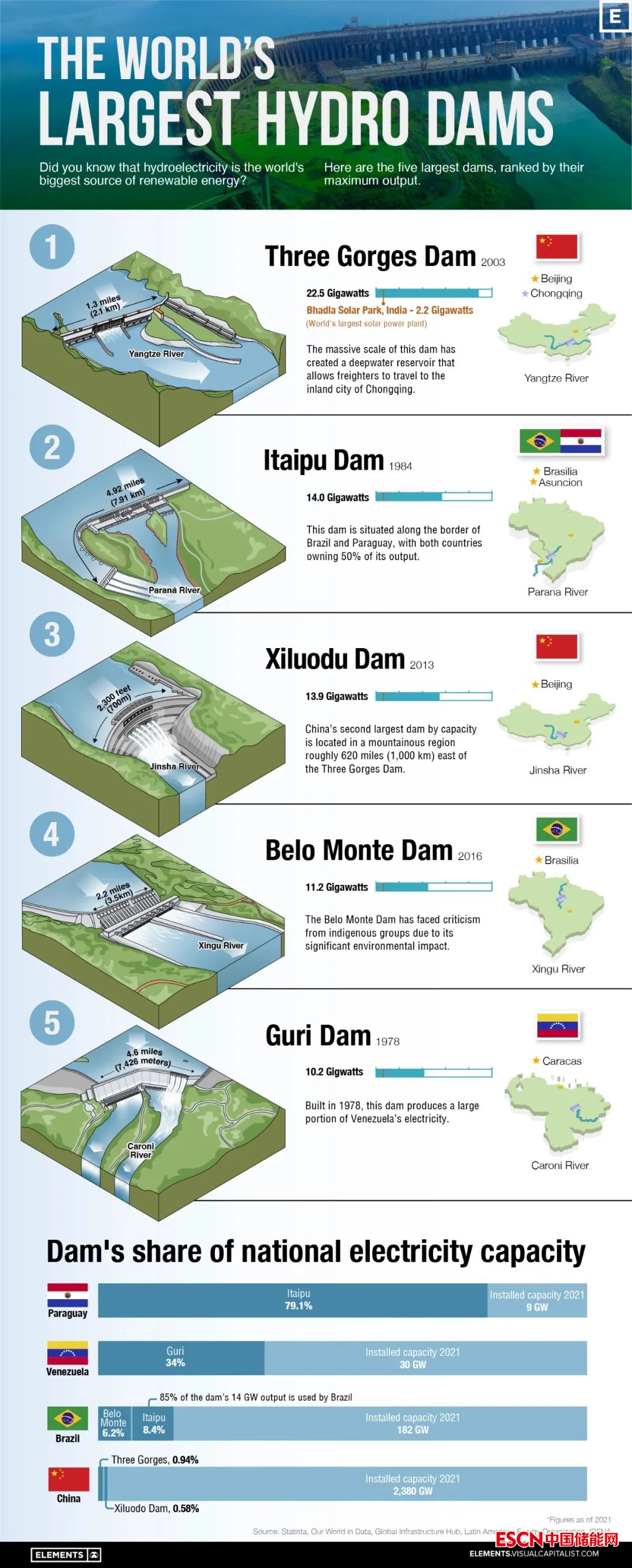 Virtual Capitalist網(wǎng)站發(fā)表信息圖顯示全球五座水電大壩的關(guān)鍵信息。位居榜首的是2003年啟用的中國三峽大壩,其裝機(jī)容量為22.5吉瓦,接近第二名伊泰普大壩的兩倍。就年產(chǎn)量而言,三峽與伊泰普大壩的實際發(fā)電量大致相同。這是因為巴拉那河的季節(jié)變化很小,這意味著全年的流量變化很小,而長江一年中有幾個月的流量大幅下降。三峽大壩是全球工程奇跡,建造成本超過320億美元。三峽水庫水庫面積1045平方公里,這個水庫的質(zhì)量足以使地球自轉(zhuǎn)減慢0.06微秒。
