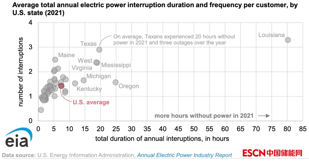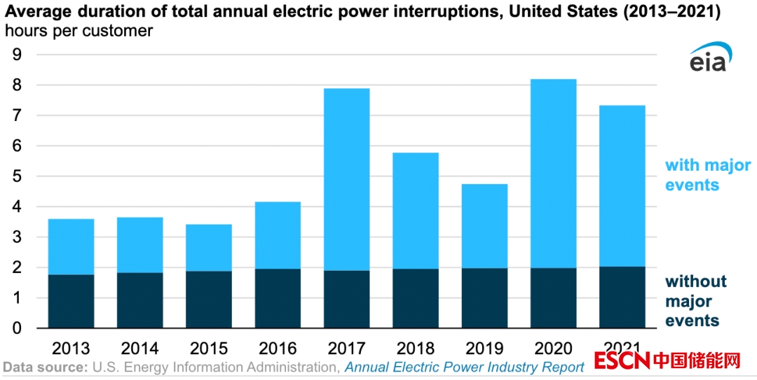 中國(guó)儲(chǔ)能網(wǎng)訊:據(jù)美國(guó)能源信息署的數(shù)據(jù),2021年美國(guó)電力用戶平均經(jīng)歷了7個(gè)多小時(shí)的電力中斷,比2020年少了一個(gè)小時(shí)。如果不包括暴風(fēng)雪、颶風(fēng)和野火等重大事件,2013年至2021年,每年的平均停電時(shí)間保持在大約2小時(shí)左右。