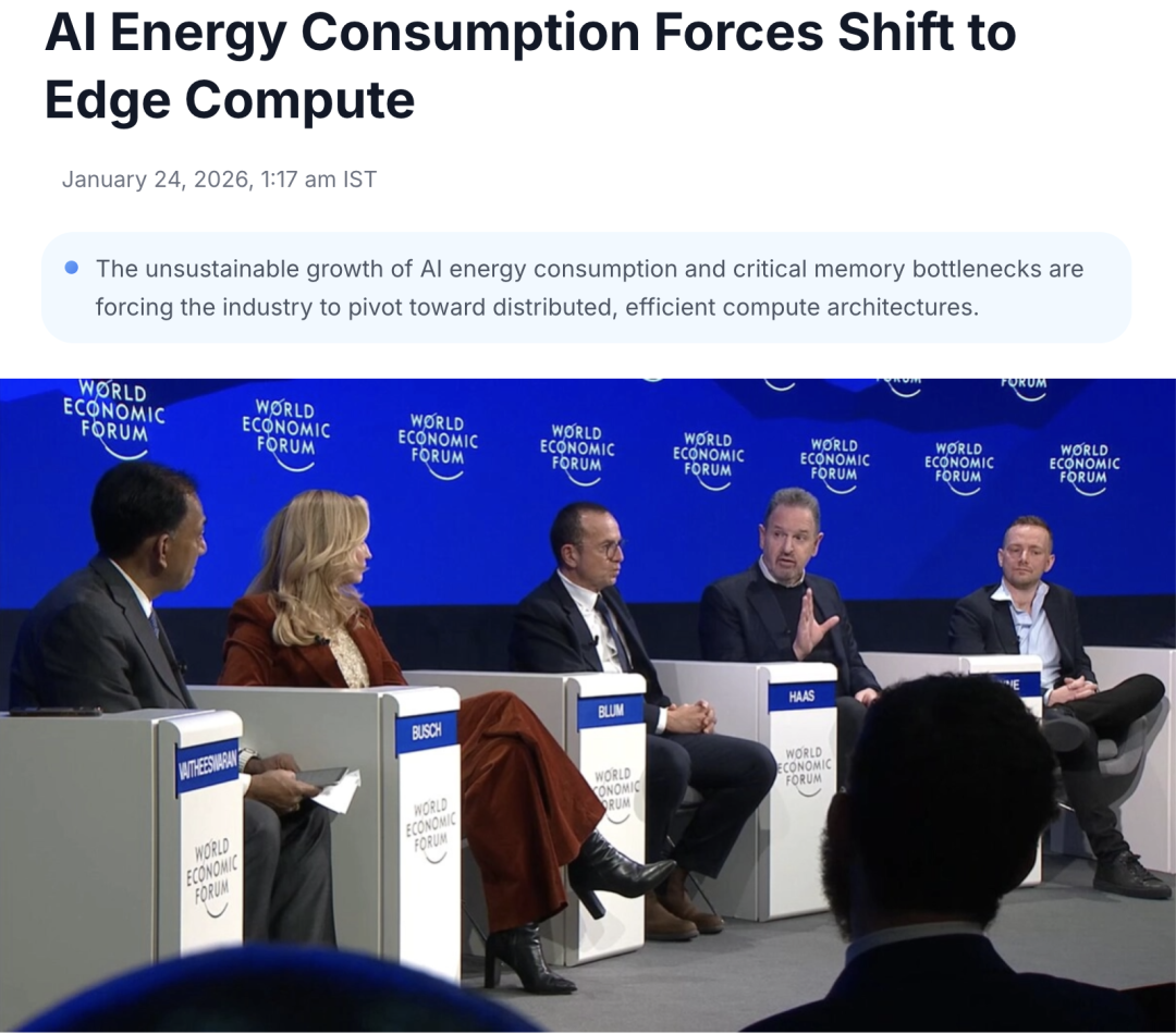 中國(guó)儲(chǔ)能網(wǎng)訊:2026年達(dá)沃斯世界經(jīng)濟(jì)論壇上,一個(gè)共識(shí)正在形成:人工智能的爆炸式增長(zhǎng)正面臨現(xiàn)實(shí)瓶頸。Arm CEO Rene Haas在接受《金融時(shí)報(bào)》專訪時(shí)確認(rèn),行業(yè)正遭遇算力、內(nèi)存,尤其是AI能耗的臨界點(diǎn),這迫使整個(gè)產(chǎn)業(yè)進(jìn)行根本性的架構(gòu)轉(zhuǎn)型。這場(chǎng)變革的核心,是從集中式云計(jì)算向分布式邊緣計(jì)算的戰(zhàn)略轉(zhuǎn)移。