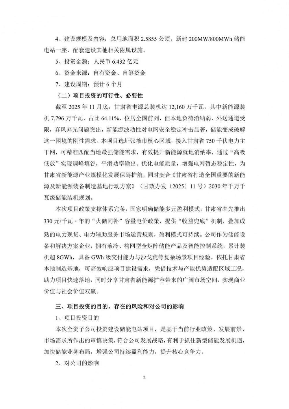 本次項(xiàng)目政策支撐體系完備,國家明確儲能多元盈利模式,甘肅省率先推出330元/千瓦年的“火儲同補(bǔ)”容量電價(jià)政策,提供“收益兜底”機(jī)制,疊加成熟的電力現(xiàn)貨、電力輔助服務(wù)市場運(yùn)營規(guī)則,盈利模式可持續(xù)。公司作為儲能設(shè)備和解決方案企業(yè),擁有液冷、構(gòu)網(wǎng)型全矩陣儲能產(chǎn)品及智能控制系統(tǒng),累計(jì)裝機(jī)超8GWh,具備GWh級交付能力與沙戈荒等復(fù)雜場景項(xiàng)目經(jīng)驗(yàn)。依托甘肅省本地制造基地,可高效響應(yīng)項(xiàng)目建設(shè)需求,憑借技術(shù)與產(chǎn)能優(yōu)勢適配區(qū)域工況,助力項(xiàng)目快速落地,同時(shí)分享甘肅省新能源擴(kuò)容帶來的廣闊市場空間,實(shí)現(xiàn)商業(yè)價(jià)值與社會價(jià)值雙贏。