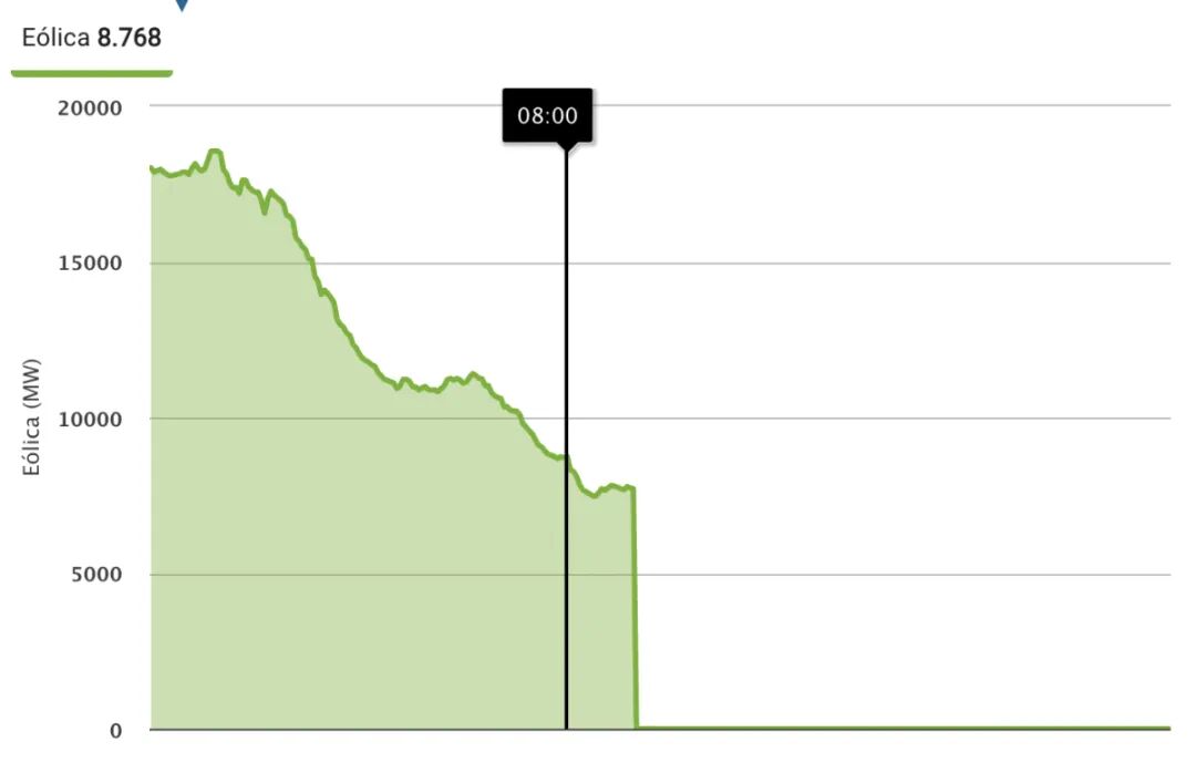 到了早上8點(diǎn)左右,REE發(fā)現(xiàn)風(fēng)電出力急劇下降,風(fēng)力發(fā)電的這一驟降(在正常情況下,該技術(shù)為西班牙提供了相當(dāng)大比例的發(fā)電量)導(dǎo)致系統(tǒng)瞬間損失了近2吉瓦的電力,這一數(shù)量相當(dāng)于一座核電站的發(fā)電量。這一缺口已經(jīng)無(wú)法通過(guò)處于備用狀態(tài)的燃?xì)饴?lián)合循環(huán)機(jī)組來(lái)彌補(bǔ)。