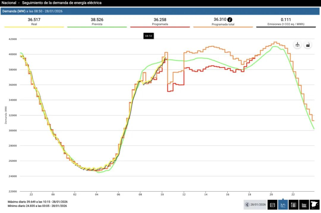根據(jù)西班牙電網(wǎng)公司提供的數(shù)據(jù),兩者之間存在超過(guò)2吉瓦的偏差。該公司原計(jì)劃此時(shí)有38,526兆瓦(MW)的電力在運(yùn)行,但實(shí)際在08:50達(dá)到的峰值僅為36,517兆瓦。