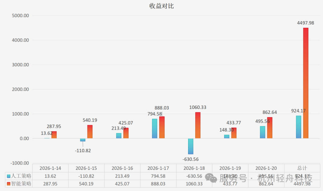 經(jīng)過連續(xù)7天的運行,以實時電價核算收益,結(jié)果令人震驚:智能策略的總收益,達到人工策略的486% 尤其在價格異動的1月18日,人工策略因誤判導(dǎo)致虧損630元,而智能策略則精準捕捉機會,實現(xiàn)盈利1060元。靜態(tài)策略在動態(tài)市場中的無力感,與智能系統(tǒng)的適應(yīng)力,形成了鮮明對比。