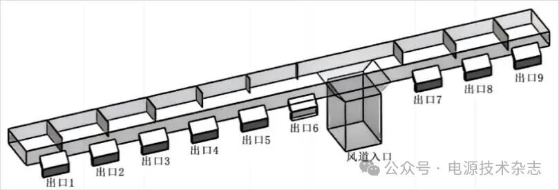 在風冷式技術發(fā)展中,散熱風道的優(yōu)化和設計是提升熱管理系統散熱效率的重點。白亞平等[9]利用由空調和風道組成的儲能系統的熱管理系統,針對額定容量為500 kWh的集裝箱式鋰電池儲能系統,對風道結構進行了重點研究,其設計涵蓋了與空調連接的軟風道、主風道及多個風道出口,以確保氣流均勻分布,設計的風道如圖2所示。實驗結果顯示,儲能系統在額定功率下運行,電池的工作溫度能夠保持在17.5和32.6 ℃之間,且溫差不超過5 ℃。康芳明等[10]針對大容量儲能電池的熱管理需求,通過多維度參數優(yōu)化研究了風道結構對散熱的影響,驗證了該結構在10 m/s風速下可實現1.55 ℃的溫差控制。楊金亮等[11]也驗證了增加風道可以提升集裝箱式儲能系統在制熱和制冷模式下的熱交換效率。