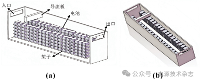上述研究顯著提升了空氣冷卻效率,但受限于儲能系統的空間,儲能散熱面臨氣流場分布不均勻和阻力特性大的問題,因此,研究者們開始探索增設導流板以及風道進出口位置優(yōu)化來改善散熱效果。Xu等[12]使用Soildworks建立儲能系統,如圖3所示。在集裝箱的入口附近增加了導流板,能夠阻擋進氣道氣流,改變電池艙內氣流場分布,使空氣在整個電池艙內流動,從而提升電池模塊的散熱效果。仿真結果顯示,增加導流板后,儲能集裝箱內溫度分布更加均勻,相比優(yōu)化前,平均溫度、最高溫度和溫差分別降低了4.57、4.3和3.65 ℃。