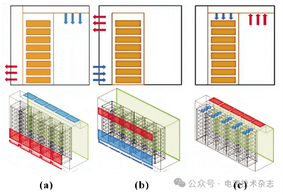該解決方案可以增強特定幾何配置中的氣流分布,但是缺乏通用性。Lin等[13]發(fā)現儲能系統在架構和形狀上與數據中心相似,均為堆疊在存儲機架中的可擴展單元集群,于是提出了布局重構的廣義解決方案,如圖4所示。圖中藍色和紅色部分分別代表冷空氣供應和熱空氣回風口,圖4(a)為原始方案,采用天花板送風和地板回流;圖4(b)為地板送風和天花板回風;圖4(c)為風道送風和天花板回風。實驗分析表明,修改后的布局,圖4(b)中溫差下降到了3.5 ℃,制冷系數從8.5增加到了34.8;圖4(c)中平均溫度下降到24.2 ℃,最大溫差下降到7.7 ℃。Yan等[14]針對緊湊型電池儲能系統,建立了四種冷卻空氣進出口方案,實驗結果也表明,將進出風口配置在機柜的同一側熱管理性能更好。