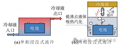 浸沒式液冷是儲能系統熱管理的前沿技術,根據冷卻液是否發(fā)生相變,可以分為單相浸沒式液冷和兩相浸沒式液冷,原理如圖10所示[31]。單相浸沒式液冷通過冷卻液與電池模組的直接接觸傳熱,傳熱過程中冷卻液始終保持液態(tài),在密封浸沒艙內完全包裹電池模組,通過循環(huán)水泵驅動形成定向流動,實現熱量交換。相較于傳統風冷及間接液冷系統,該技術具有優(yōu)越的導熱效能、高儲熱流密度和溫度均衡性。Satyanarayana等[32]對比了自然風冷、強制風冷與單相浸沒式冷卻,發(fā)現在3 C放電倍率下浸沒式液冷的冷卻效果最好,是一種安全高效的熱管理技術,適用于高能量密度和大電流運行工況下的鋰離子電池。Wu等[31]設計制造了一種基于硅油的單相浸沒式液冷,以30并28串的鋰離子電池模組為研究對象進行實驗,結果顯示直接接觸式液冷相比于間接液冷散熱系統集成率更高,最大溫升和最大溫差顯著降低。然而單相液冷從電池單體和模組遷移到大規(guī)模、高密度的儲能系統中還需要諸多實驗驗證。冷卻介質的流動傳熱機制需與高密度電池簇的儲能結構動態(tài)適配,優(yōu)化冷卻液流速控制和黏度參數等方面實現系統功耗和散熱表現的平衡。綜合考慮冷卻液選型、散熱結構設計和運行成本,兼顧熱管理效率與運行周期的經濟性。