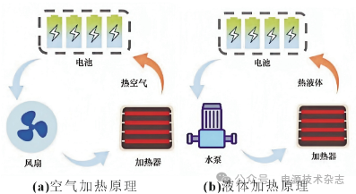 面向規(guī)模級儲能系統的加熱方式通常分為外設加熱器和熱泵空調加熱兩種。加熱器加熱主要依托電阻式加熱元件與對流換熱的方式實現電池組的加熱。如圖12所示,加熱器將傳熱介質加熱,通過風扇和水泵將熱空氣、熱液體與儲能電池組進行熱量交換[42]。楊藝云等[43]基于加熱器和空調設計熱管理系統,當集裝箱內溫度低于5 ℃時,開啟加熱器進行空氣加熱對電池進行溫控,該方法簡單易用,在儲能項目中取得了良好效果。正溫度系數(positive temperature coefficient,PTC)電加熱器因結構簡單、成本低,成為低溫加熱器的主要選擇。如程鵬飛[44]和帥昌俊[23]等人通過冷卻液回路和冷媒回路構建熱管理回路,在低溫工況下關閉冷媒回路,啟動PTC加熱器將電能轉換成熱能,通過功率控制達到合適的冷卻液運轉溫度,隨后由水泵驅動沿管路流經電池組實現與集裝箱內儲能單元的換熱。