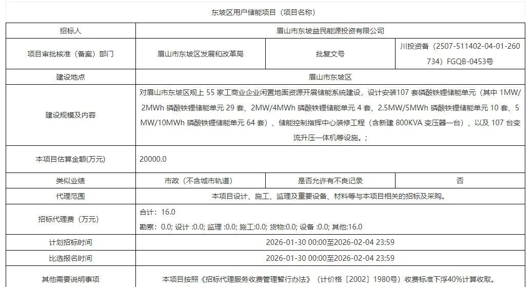 中國儲能網(wǎng)訊:2026年1月30日,四川省兩大用戶側(cè)儲能項目發(fā)布招標(biāo)公告,總規(guī)模482MW/964MWh。
