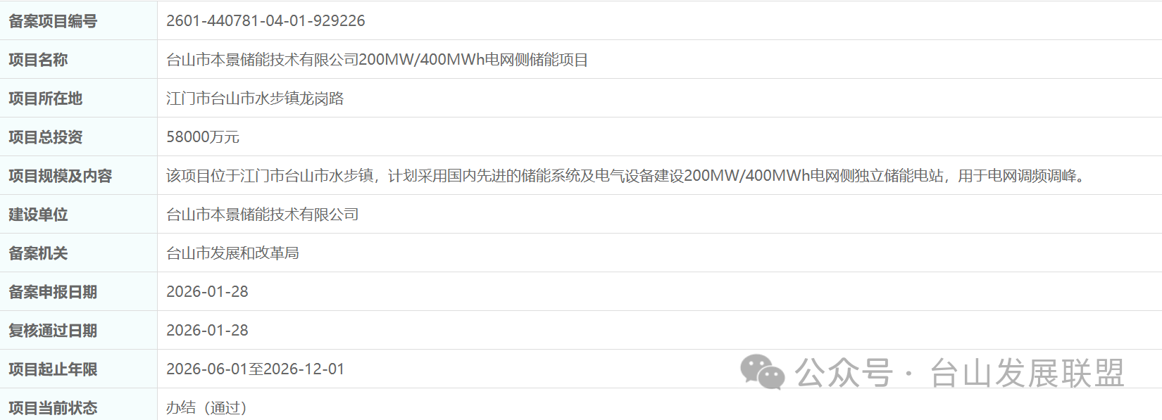 中國儲能網(wǎng)訊:近日,廣東省投資項目在線審批監(jiān)督平臺發(fā)布臺山市本景儲能技術(shù)有限公司200MW/400MWh電網(wǎng)側(cè)儲能項目。