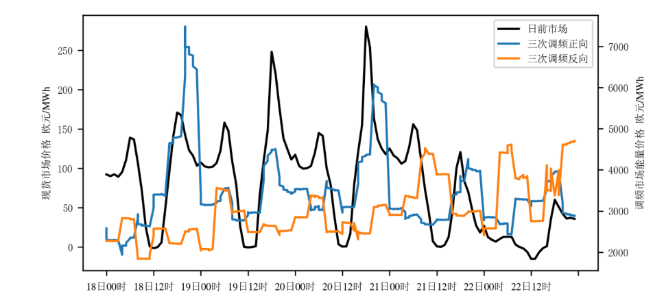 圖3和4為2025年3月18日至22日德國各類電源出力功率、跨國交換電量的變化趨勢,以及德國電力現(xiàn)貨市場日前交易價格、輔助市場電能量價格。其中,日前價格與新能源出力,尤其是光伏出力呈現(xiàn)緊密的負(fù)相關(guān)性,而在新能源出力快速爬坡與下降的上午7時至8時、下午16時至18時,日前市場收益達(dá)到高峰,該時段燃?xì)鈾C組、抽蓄機組頂峰出力,以爭取更大的現(xiàn)貨市場收益。而在21日至22日大部分時段以及20日中午光伏出力高峰階段,火電機組僅基于供熱需求和啟停限制,保持較低限度出力。此外,調(diào)頻市場中能量結(jié)算價格可以達(dá)到現(xiàn)貨市場的28倍左右,尤其在每日上午光伏爬坡時期對反向調(diào)節(jié)能力,以及在晚間22點后電網(wǎng)整體負(fù)荷快速下降時期,對正向調(diào)節(jié)能力的需求,為具備快速調(diào)節(jié)能力的機組提供更多的收益機會。