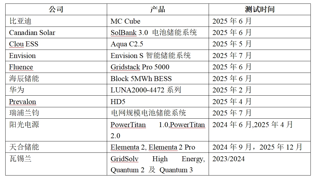 下表為已公布或報道進行過大規(guī)模防火測試(LSFT)的電池儲能系統(tǒng)制造商與集成商。該清單并不完整,隨著大規(guī)模防火測試(LSFT)成為強制性要求,預(yù)計 2026 年將有更多廠商完成測試。