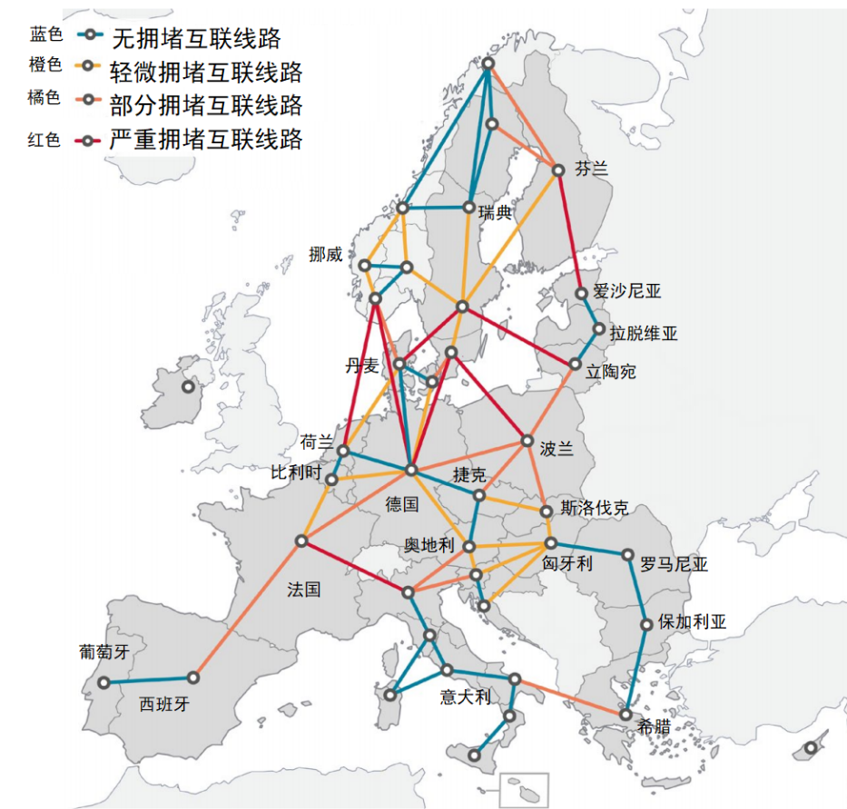 圖1 歐盟各競價(jià)區(qū)電網(wǎng)擁堵情況示意圖(來源:歐盟能源監(jiān)管合作署ACER)