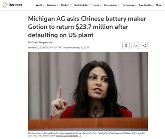 近日,據(jù)路透社報(bào)道,美國(guó)密歇根州總檢察長(zhǎng)丹娜·內(nèi)塞爾正式發(fā)起法律行動(dòng),要求中國(guó)電池企業(yè)國(guó)軒高科旗下美國(guó)子公司GotionInc.退還2370萬(wàn)美元州政府補(bǔ)貼。這筆資金原本用于支持國(guó)軒高科在該州建設(shè)一座價(jià)值24億美元的電池材料工廠,如今隨著項(xiàng)目終止,州政府啟動(dòng)資金追討程序,限令國(guó)軒高科在收到信函后的30天內(nèi),全額償還這筆2370萬(wàn)美元的款項(xiàng)。